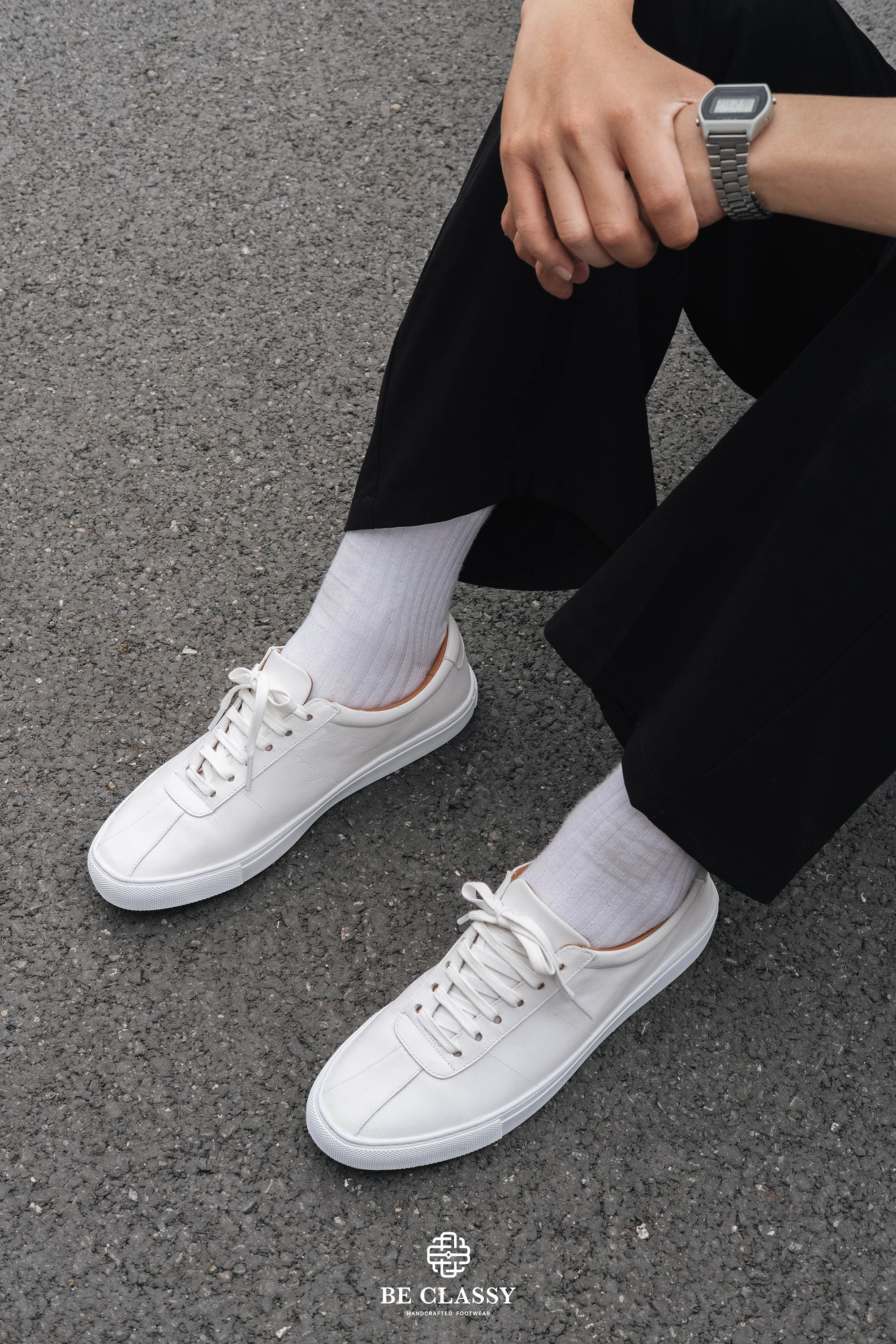 Một đôi White Sneaker sẽ là lựa chọn tuyệt vời nhất để dung hòa cả hai yếu tố thể thao và dạo phố. Ngoài ra, với thiết kế tối giản không quá nhiều họa tiết, sắc trắng cơ bản có thể phối với bất kỳ màu sắc nào, đôi giày da nam này còn có thể kết hợp được với cả các set đồ công sở như suit, blazer, quần âu.