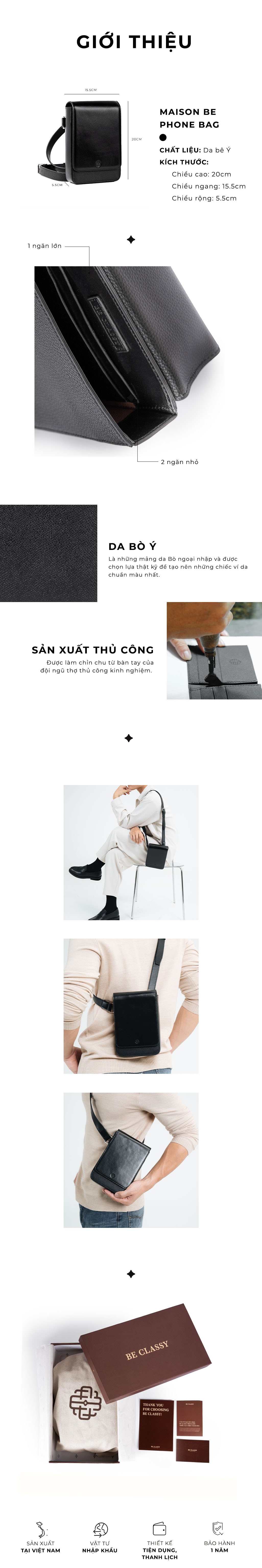 Những chiếc túi da nam là item không thể thiếu trong việc nâng tầm phong cách của các quý ông. Maison Be Phone Bag được làm hoàn toàn từ da thật đó là chất liệu da Bò Ý cao cấp, và được chế tác thủ công từ đôi bàn tay của những người thợ lành nghề lâu năm.