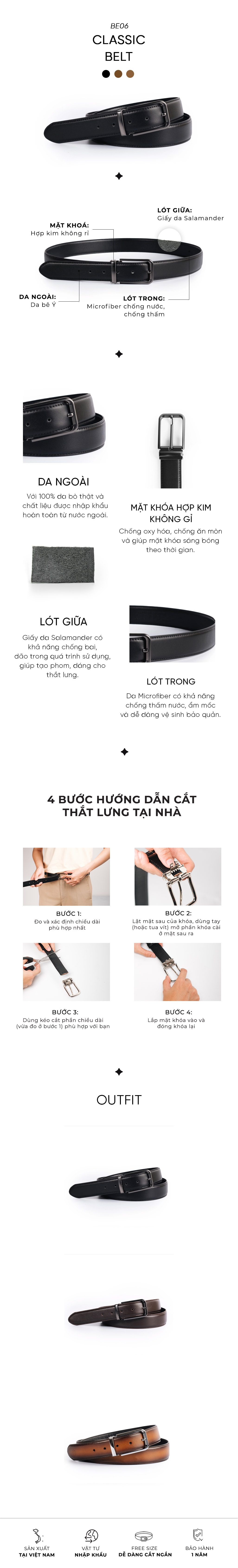 Mẫu thắt lưng đẹp được chế tác hoàn toàn từ đôi tay của những người thợ lành nghề lâu năm. Về chất liệu, chúng được làm hoàn toàn từ da Bò Ý cao cấp nhập khẩu, mang đến sự bền bỉ và không kém đi yếu tố sang trọng, tinh tế.