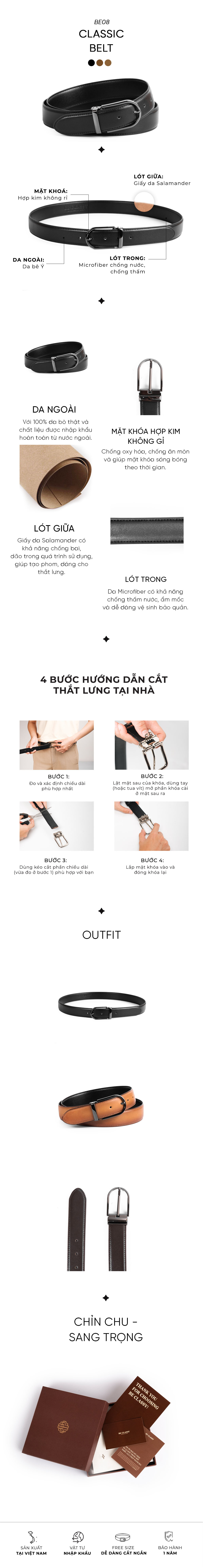 Những chiếc thắt lưng nam là item không thể thiếu trong việc nâng tầm phong cách cũng như khẳng định vị thế của các quý ông. Classic Belt được làm hoàn toàn từ da thật đó là chất liệu da Bò Ý cao cấp, và được chế tác thủ công từ đôi bàn tay của những người thợ lành nghề lâu năm.