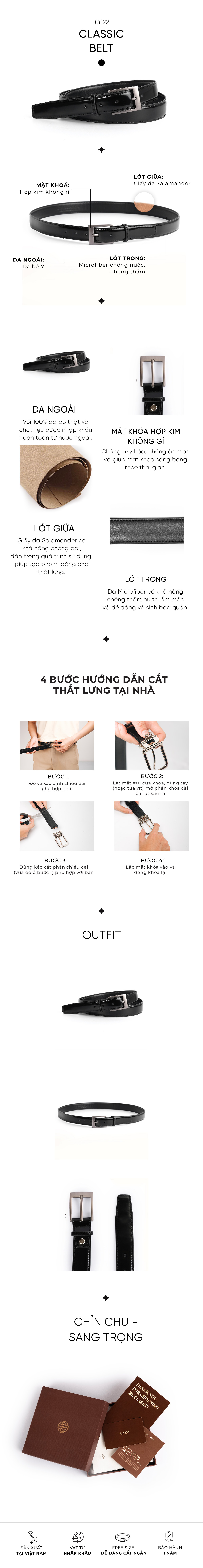 Những chiếc thắt lưng nam là item không thể thiếu trong việc nâng tầm phong cách cũng như khẳng định vị thế của các quý ông. Classic Belt được làm hoàn toàn từ da thật đó là chất liệu da Bò Ý cao cấp, và được chế tác thủ công từ đôi bàn tay của những người thợ lành nghề lâu năm.
