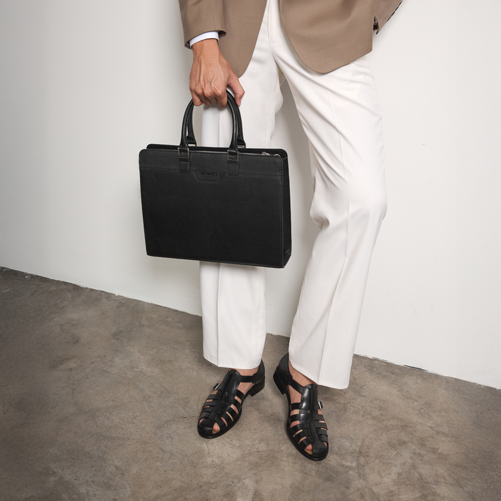 Từng lớp da đan trong BST OMW FISHERMAN vừa là chi tiết trang trí, vừa là ngôn ngữ của sự khéo léo và tinh thần thủ công đậm chất Be Classy. Những sợi da bò Ý cao cấp được xử lý tỉ mỉ, đan xen thành cấu trúc thoáng khí nhưng vẫn chắc chắn, đem lại cảm giác nhẹ nhàng, dễ chịu khi di chuyển.