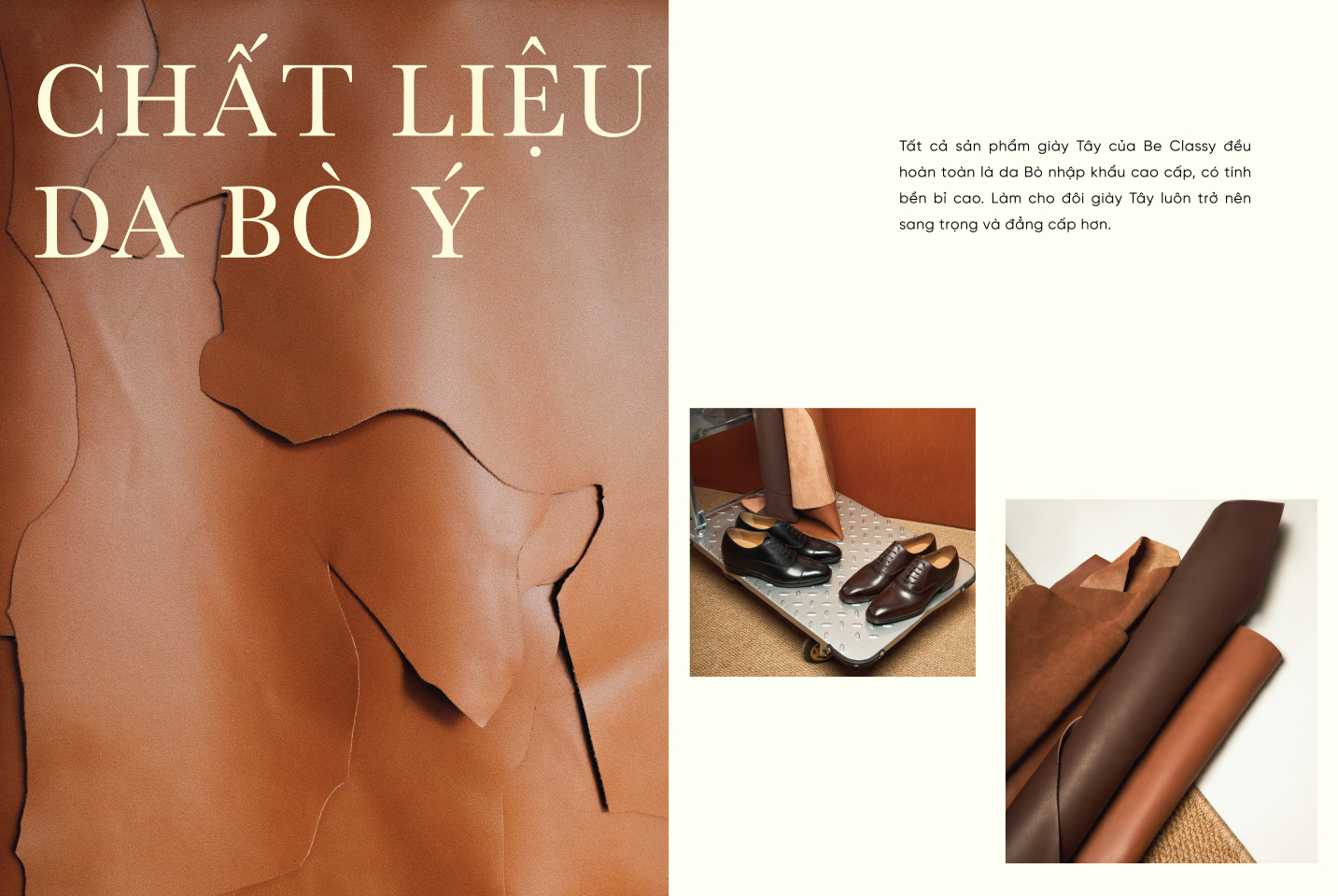 Trong catalogue lần này, chất liệu da bò Ý cao cấp sẽ được “phơi bày” như minh chứng cho triết lý làm nghề của Be Classy. Từ những tấm da thật được chọn lựa khắt khe, đến kết cấu đế, form, lót đều được trình bày rõ ràng giúp bạn cảm nhận được vẻ đẹp ẩn sau mỗi sản phẩm. Đó là lời khẳng định rằng “chất liệu tốt tạo nên bản lĩnh của đôi giày Tây, cũng như bản lĩnh của người đàn ông chọn nó.”