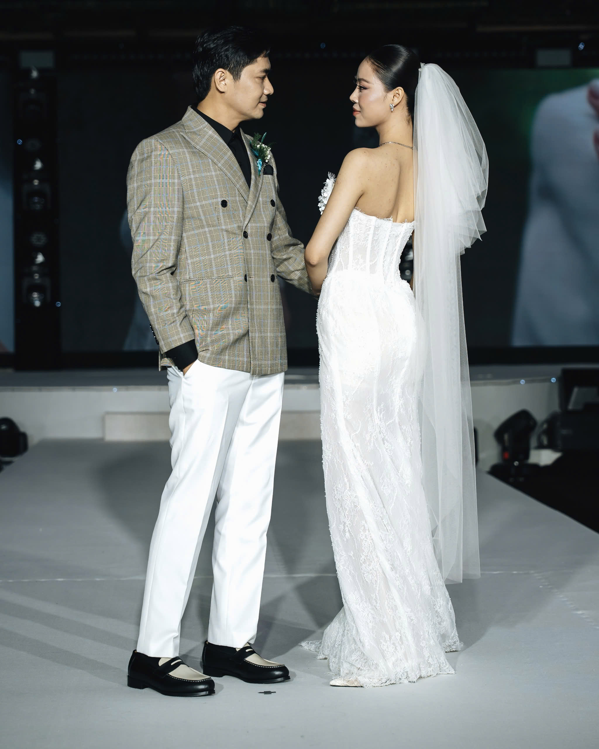 Điểm sáng của show diễn còn nằm ở sự cộng hưởng từ nhiều thương hiệu danh tiếng. Suits và giày Tây mang lại thần thái mạnh mẽ, kết hợp cùng trang sức PNJ, váy cưới lộng lẫy của Hestia và Bella Bridal, tất cả cùng hòa quyện, tạo nên một bức tranh thời trang đa sắc thái. Sự tinh tế trong từng chi tiết đã biến sàn diễn thành sân khấu nghệ thuật trọn vẹn.