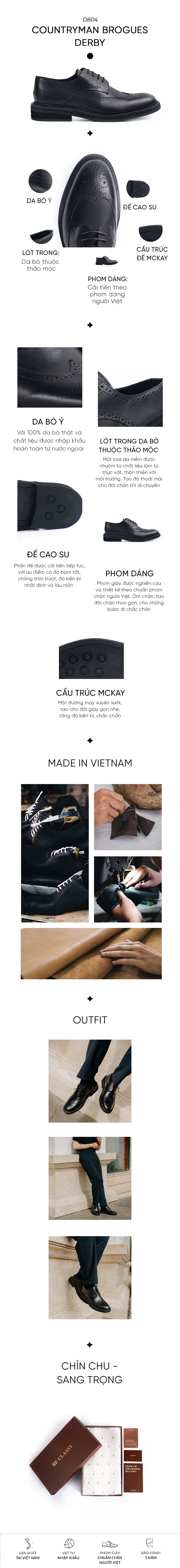 Sản phẩm giày tây Be Classy được làm từ da bò Ý, Lót trong da bò mộc, đế được khâu cấu trúc McKay, đế cao su với những lỗ chống trơn. Hoạ tiết đục lỗ kết hợp cùng phom dáng trẻ trung, đây chắc chắn là mẫu Derby bạn đang tìm kiếm.