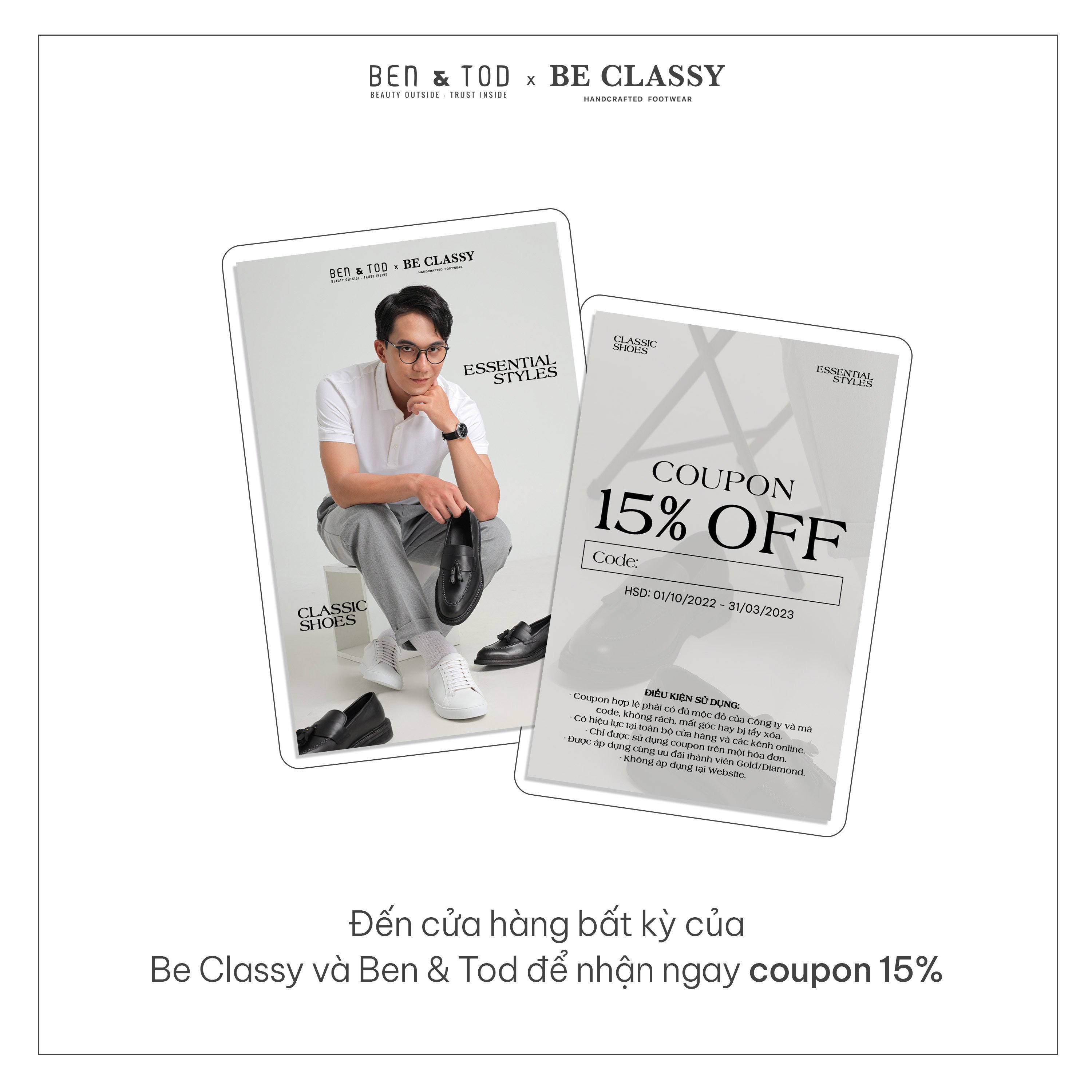* GIFT VOUCHER 15% sẽ được "trao tay" khi khách hàng mua sắm tại cả 2 thương hiệu Be Classy - Ben&Tod. Cơ hội nhận Gift Voucher từ ngày 01.10.2022 - 31.03.2023.