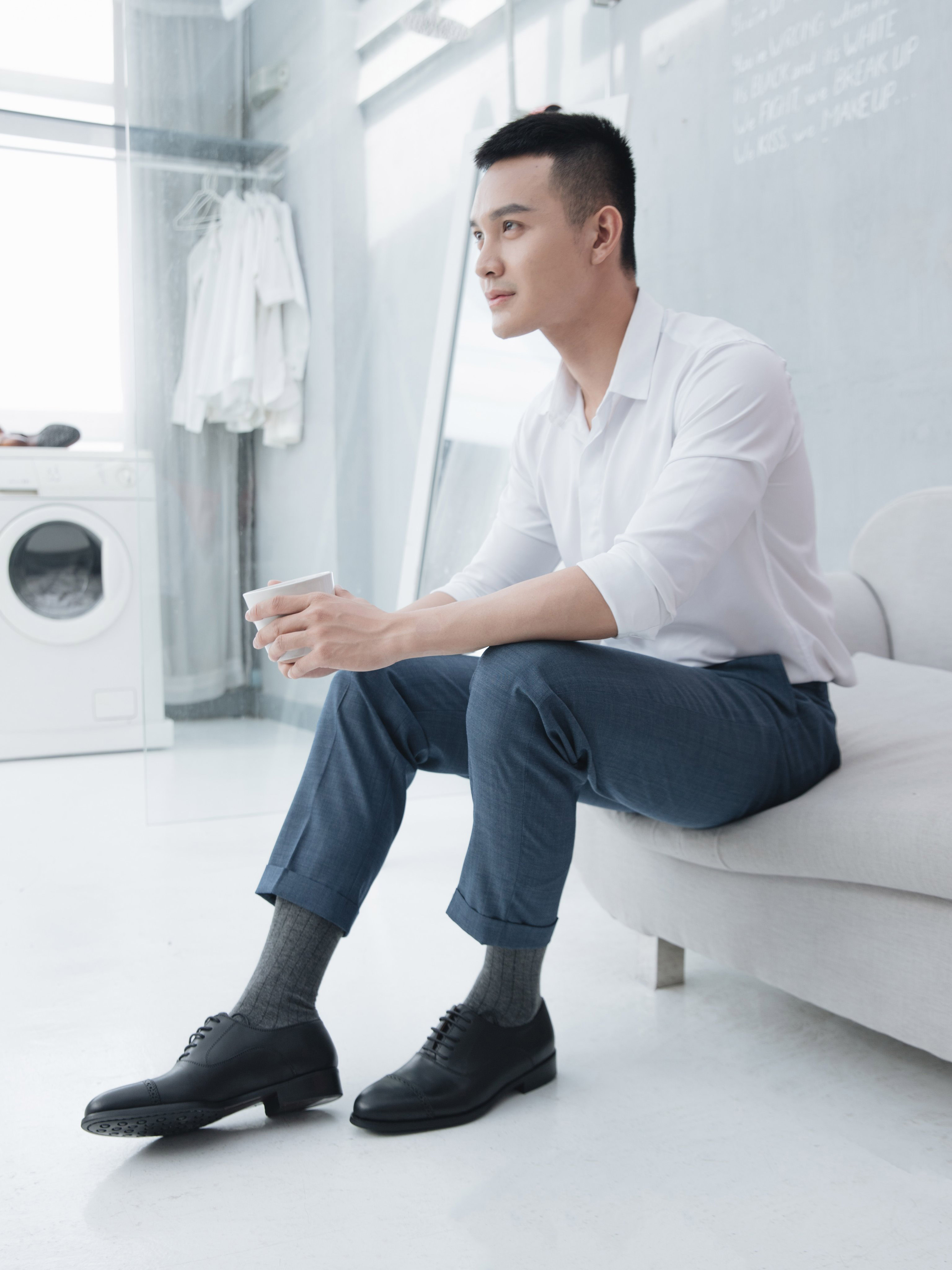 Trong set trang phục này thì đôi giày Tây công sở nên chọn hãy là màu đen luôn nhé, để ấn tượng bạn có thể chọn một đôi Tất có màu cùng tone hoặc cùng màu với áo Blazer bạn chọn. Mọi thứ sẽ trở nên đồng bộ.