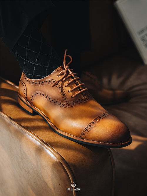 Hãy chọn một đôi giày Tây Oxford có họa tiết vừa đủ với phong cách này, đừng chọn đôi giày trơn không họa tiết vì nó sẽ làm tổng thể trông đơn điệu. Đôi giày tinh tế phối cùng một chiếc áo sơ mi vừa người và chiếc Caravat vừa đủ tinh tế để nổi bật nhất. Set trang phục này sẽ giúp bạn trông trẻ trung hơn nhưng vẫn không kém đi sự sang trọng.