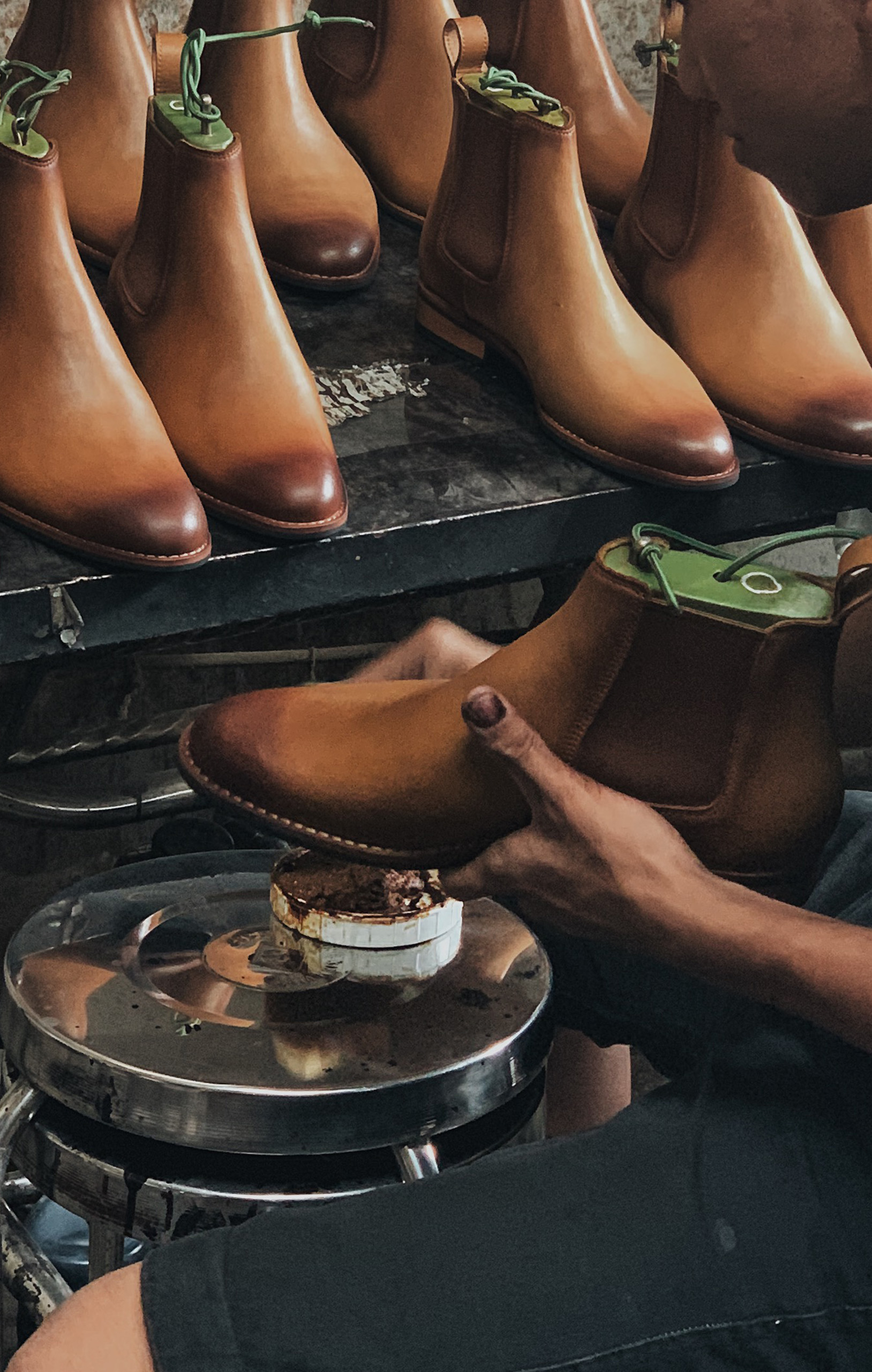 Nghệ nhân sẽ bắt đầu đánh một lớp màu lót nhẹ đều lên đôi giày, sau đó họ sẽ đánh một cách tỉ mỉ sao cho đến khi thành phẩm đôi giày ra được màu như ý muốn. Chính vì được đánh màu thủ công nên mỗi đôi giày tây Patina luôn chỉ có một và duy nhất, ngay cả khi trong cùng một đôi nhưng về màu sắc vẫn có sự khác biệt nho nhỏ.