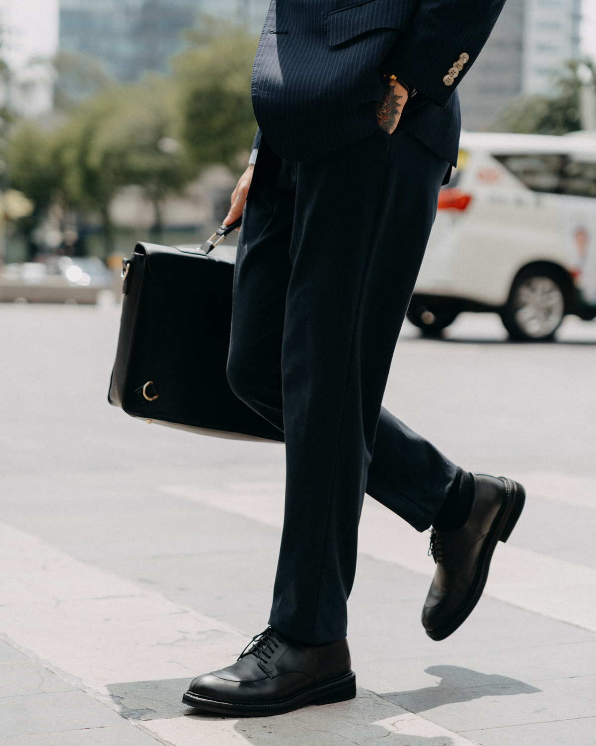 Thanh lịch và dễ sử dụng, giày Derby nam là lựa chọn hoàn hảo cho bộ trang phục công sở. Các Quý ông có thể kết hợp chúng với những bộ suit tối màu như đen, xám hoặc xanh navy, outfit này sẽ tạo nên vẻ ngoài chuyên nghiệp và lịch lãm. Đừng quên thêm một chiếc cà vạt và đồng hồ để bộ trang phục hoàn thiện và chỉn chu hơn.