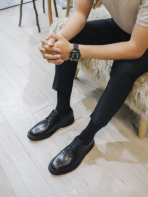 Cả Outfit được ghi điểm là khi bộ trang phục bạn chọn, phù hợp với phụ kiện và đôi giày mang dưới chân. Giày Tây đen chính là phụ kiện mà đàn ông luôn có trong BST giày của riêng mình. Bởi màu đen vô cùng dễ phối và còn cực ngầu khi diện.