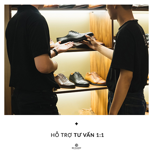 Không phải lo lắng về việc không định hướng được phong cách, Be Classy có đội ngũ tư vấn luôn hỗ trợ tận tình, tư vấn 1:1 trực tiếp tại cửa hàng giúp Quý Ông chọn được đôi giày phù hợp nhất. Hỗ trợ tư vấn chọn và đặt giày Online một cách nhanh chóng.