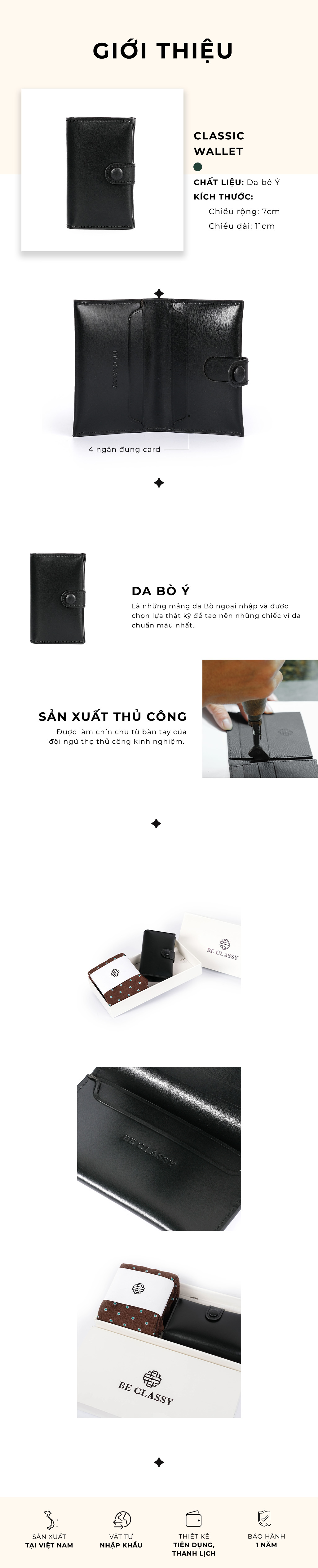 Với thiết kế khóa bấm chắc chắn, chất liệu da bò Ý cao cấp cùng màu đen tối giản, chiếc ví mang lại cảm giác an tâm cho việc cất giữ thẻ và giấy tờ quan trọng. Một phụ kiện nhỏ gọn, vừa tay nhưng đầy phong cách và đáng sở hữu từ Be Classy.